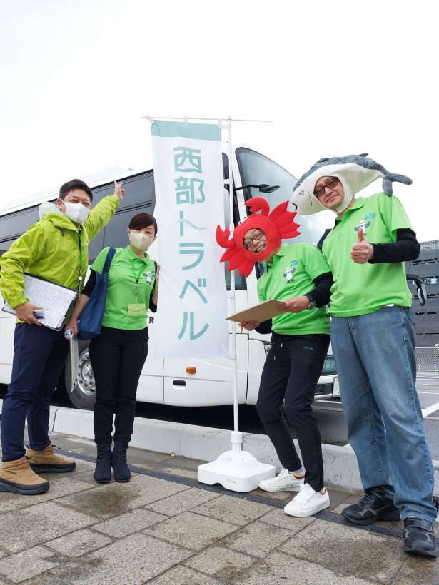わが社の代表もカニとブリの被り物でお出迎えです(*’▽’)