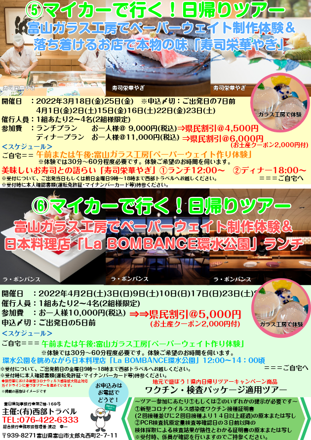 マイカーで行く!日帰りツアー①~⑥発売開始 2022/3/10~4/28