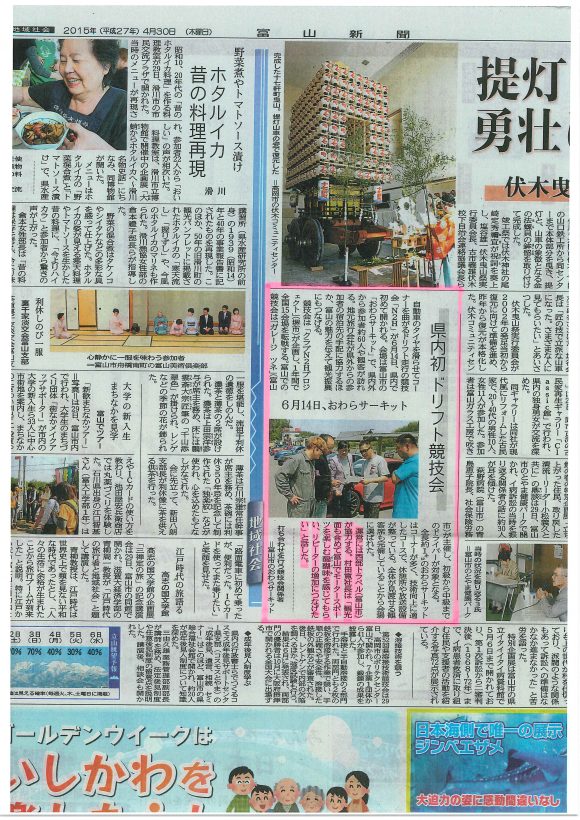 富山新聞 2015年4月30日 県内初ドリフト競技会