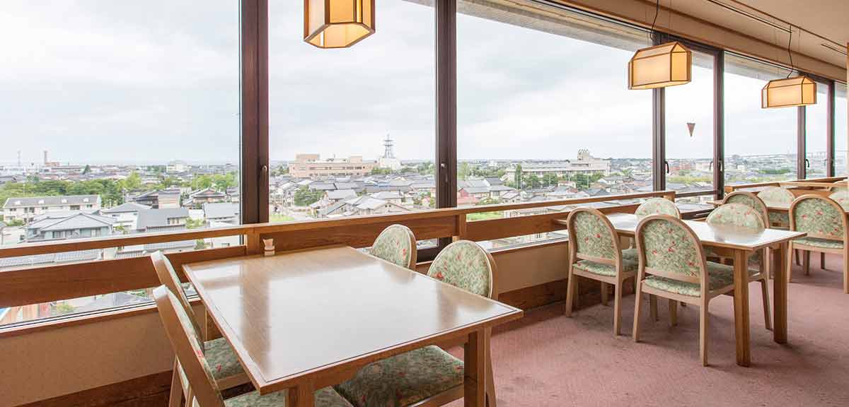 窓からは立山連峰の雄姿、能登半島、富山湾が眺望でき日本海の新鮮な魚介類が随時ご賞味いただけます。