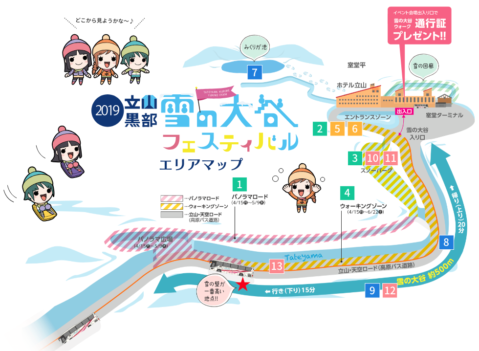宇奈月温泉発₍8:45発₎==黒部宇奈月温泉₍9:10発₎==金太郎温泉₍9:40発₎==立山町ささら屋₍10:30発₎==立山「雪の大谷ウォーク」₍12:00~14:30₎==立山町ささら屋₍16:00~16:30₎ショッピング==金太郎温泉₍17:20着₎==黒部宇奈月温泉(₍17:50着₎==宇奈月温泉₍18:10着₎
