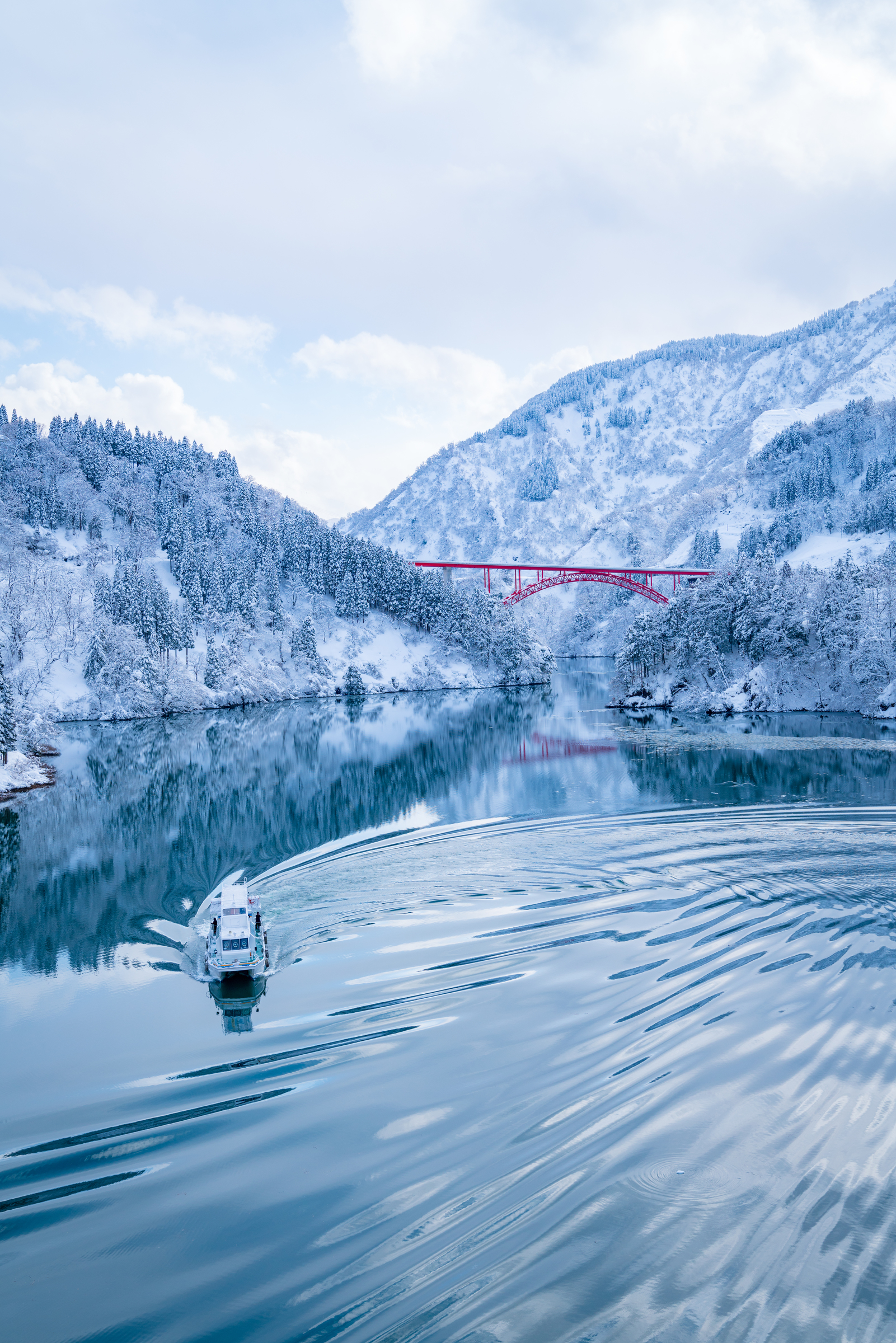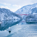 静かなモノトーンの世界の中で、遊覧船から眺める冬の富山の絶景スポット。船内は暖房がきいてますので暖かいです