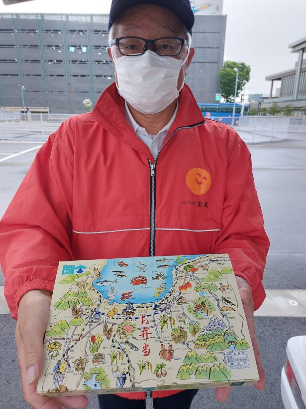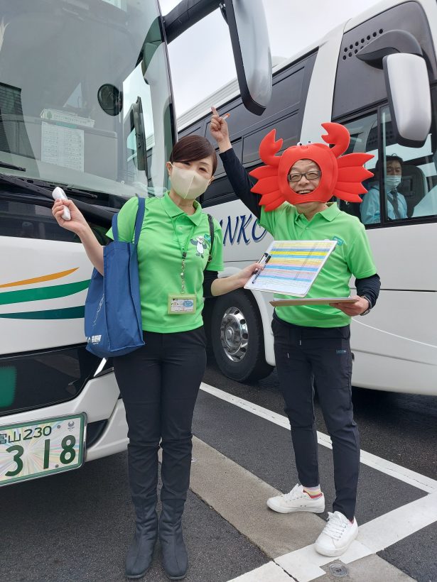 わが社の代表もカニとブリの被り物でお出迎えです(*’▽’)