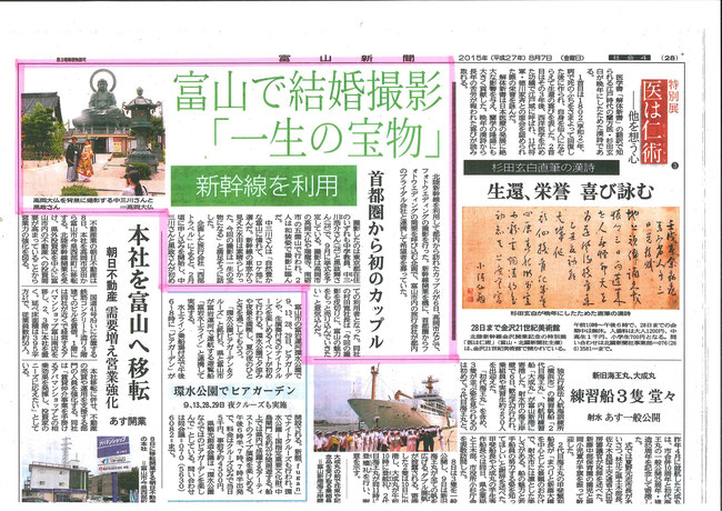 • 富山新聞 2015年8月7日 富山で結婚撮影