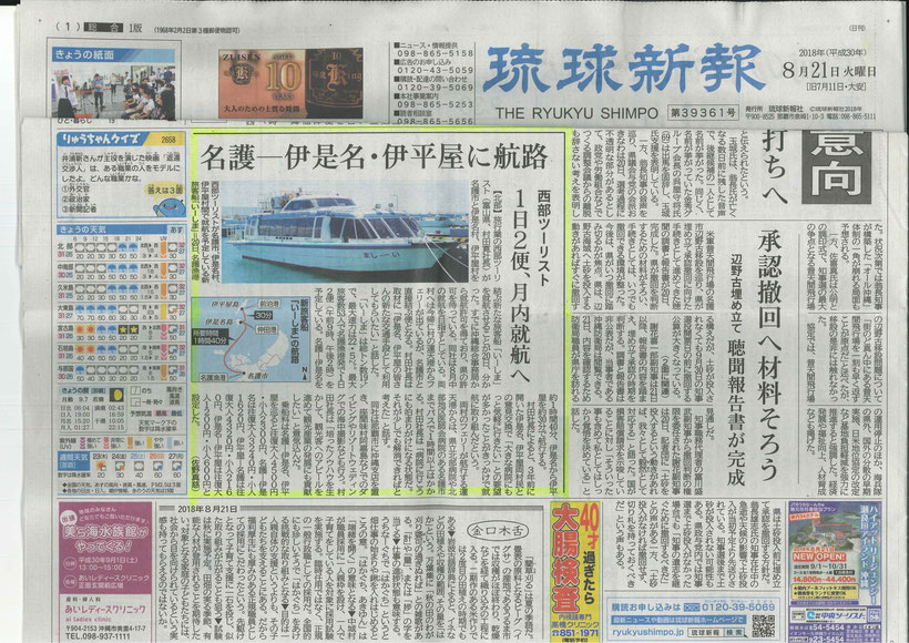 • 琉球新報 ・沖縄タイムス 2018年8月21日「名護~伊是名・伊平屋に新航路」